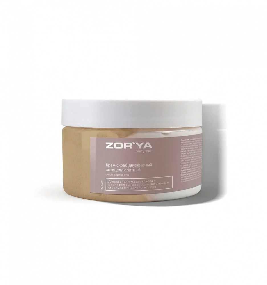 Крем-скраб двухфазный антицеллюлитный масло кофейных зерен и скорлупа миндального ореха cream cappuccino ZOR`YA body cult 250 мл